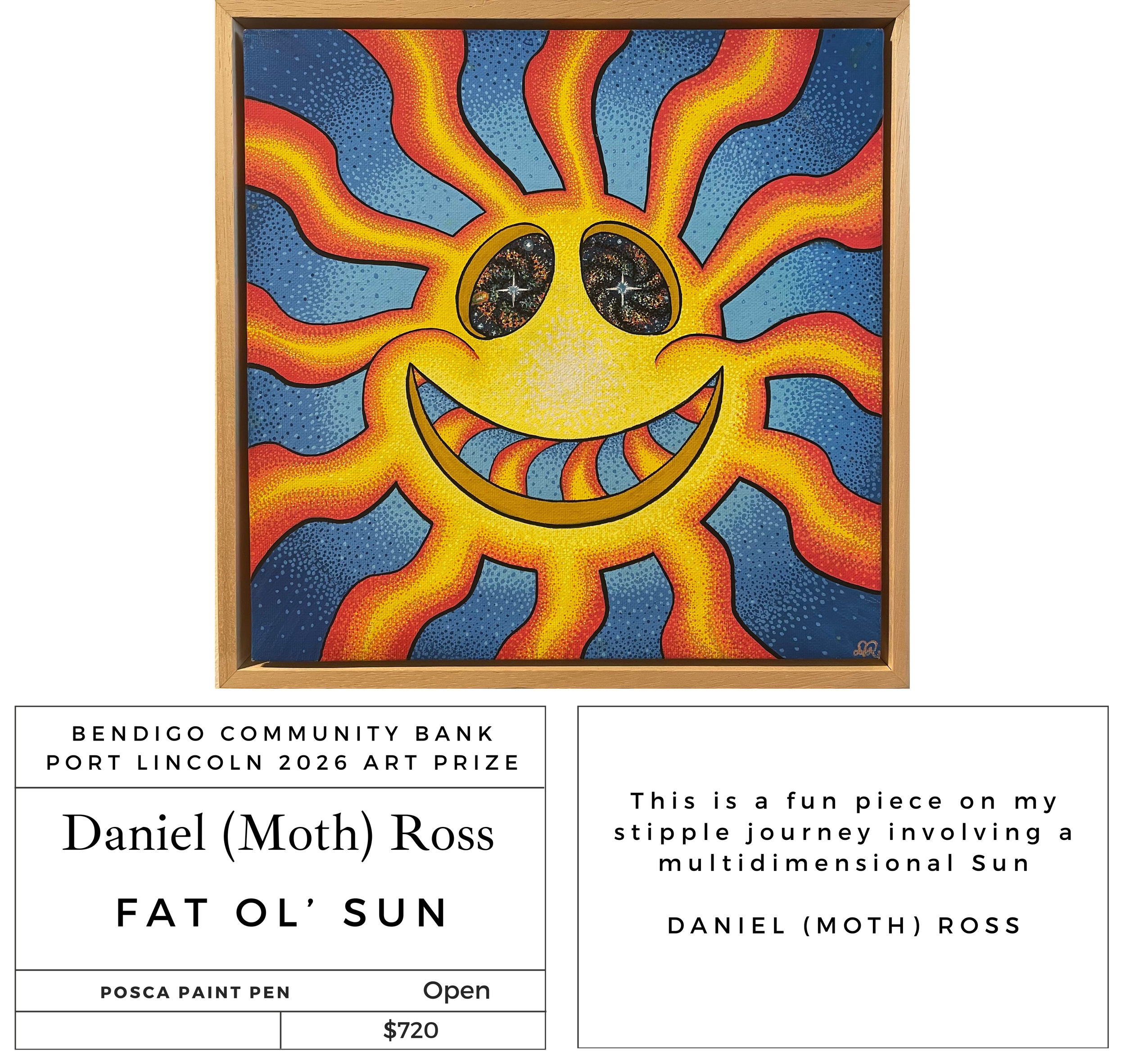 ““Guardian of Dreams” is a pointalism artwork that explores the complex area of my mind, where my personal goals, fears and life resides. This artwork is the gateway into my sanctuary, where I am in charge of maintaining inner peace”