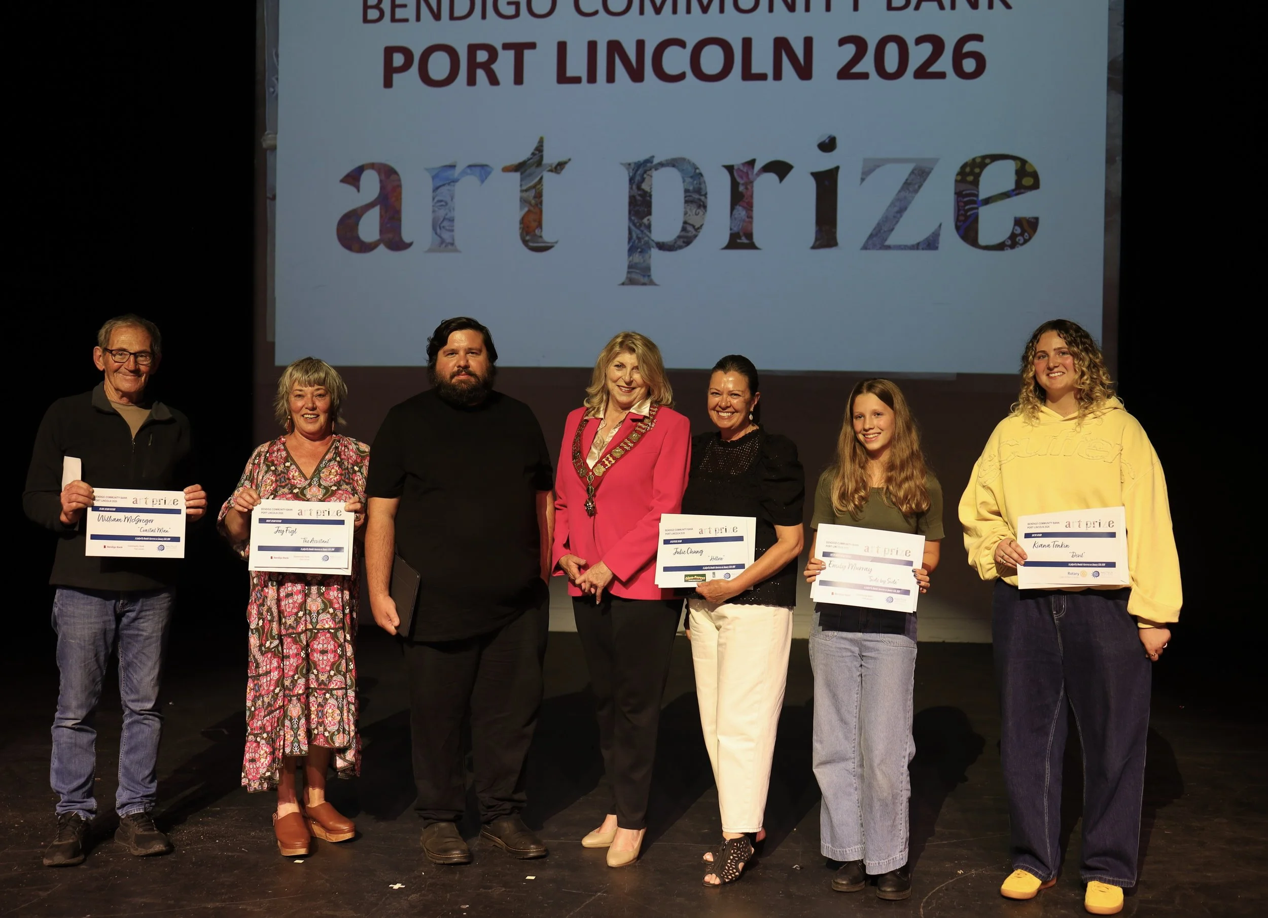 Art Prize Major Award Winner Will Macgregor, Merit Award Winner Joy Figl, Art Prize Judge Dominic Guerrera, City of Port Lincoln Mayor Diana Mislov, Sculpture Award Winner Julie Chung. Youth Merit Award Winner Emily Murray and Youth Award Winner Kiana Tonkin. Not present are Local Artist Award Winner Leith O’Malley, Merit Award Winner Megan Roodenrys and Highly Commended Youth Award Winner Zoe van-Overdijk. Image courtesy Belili Cowley