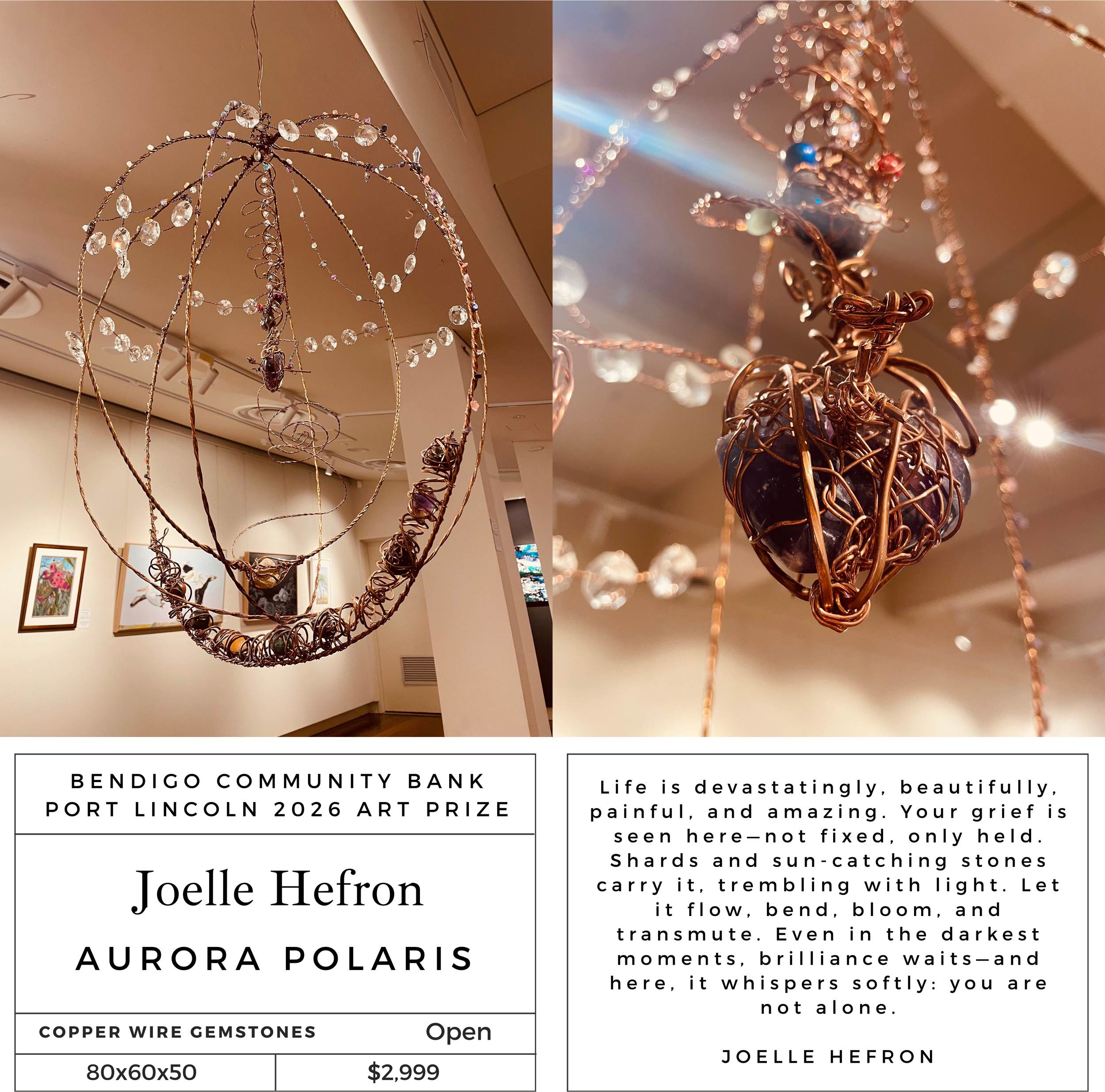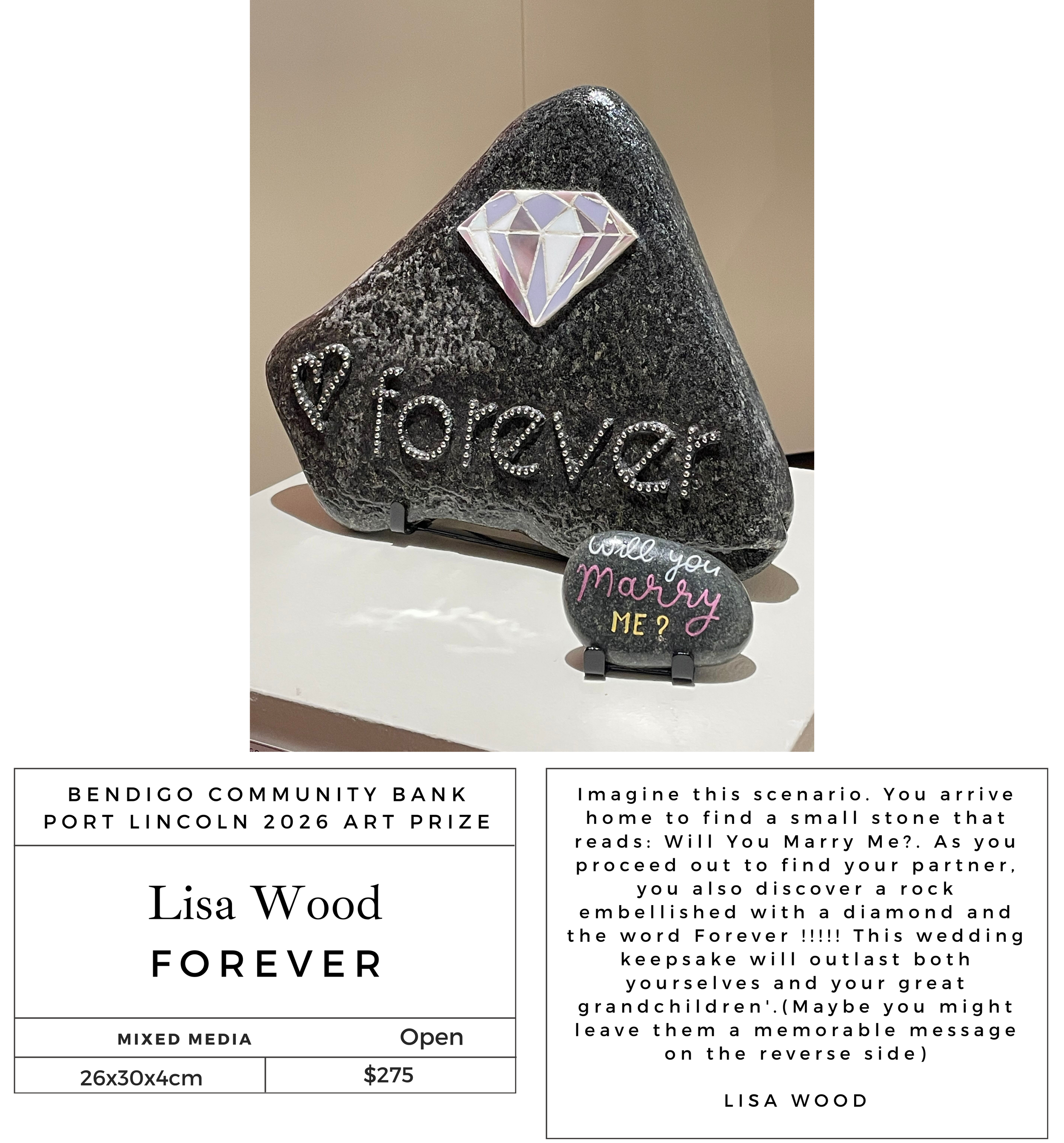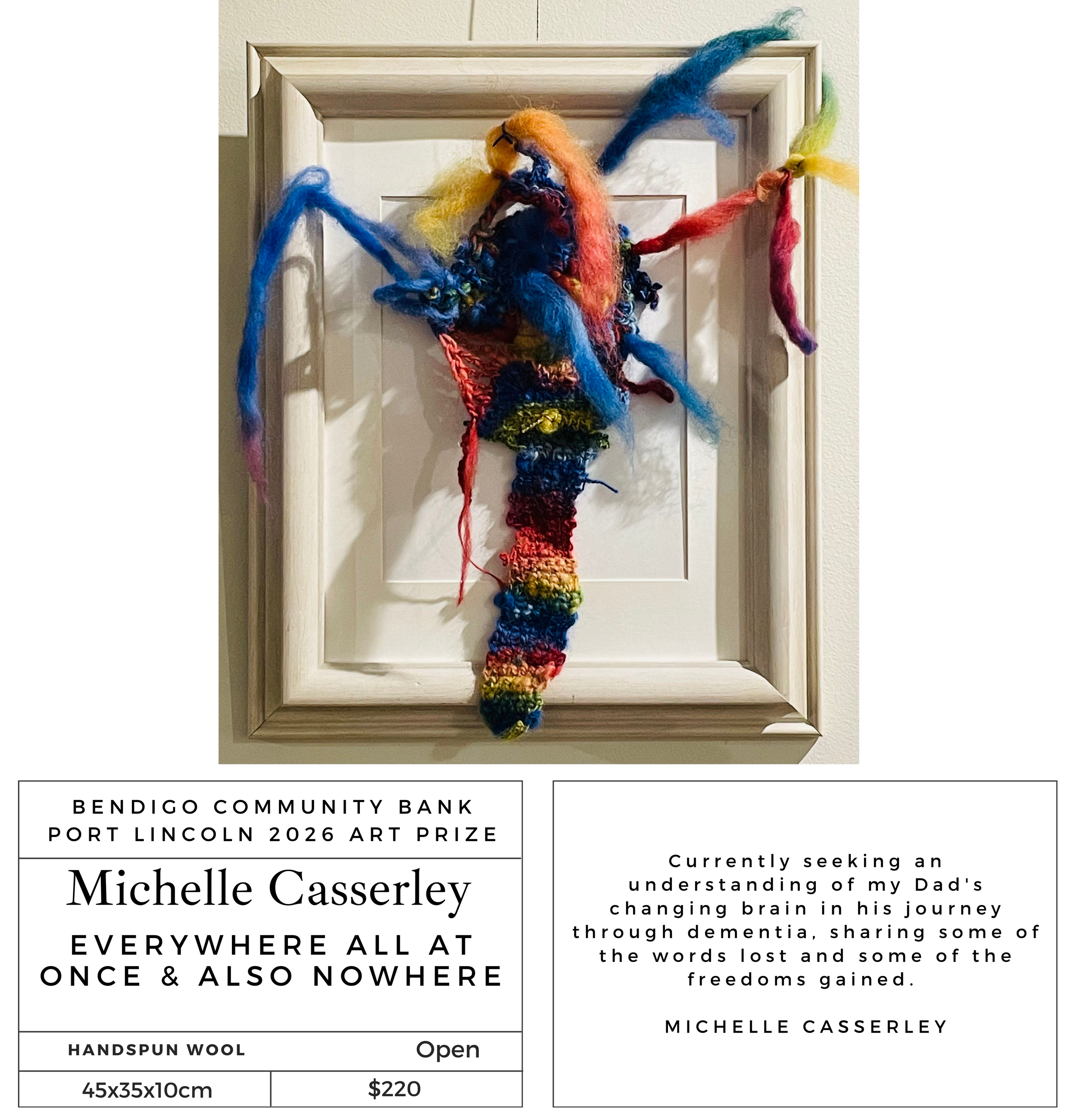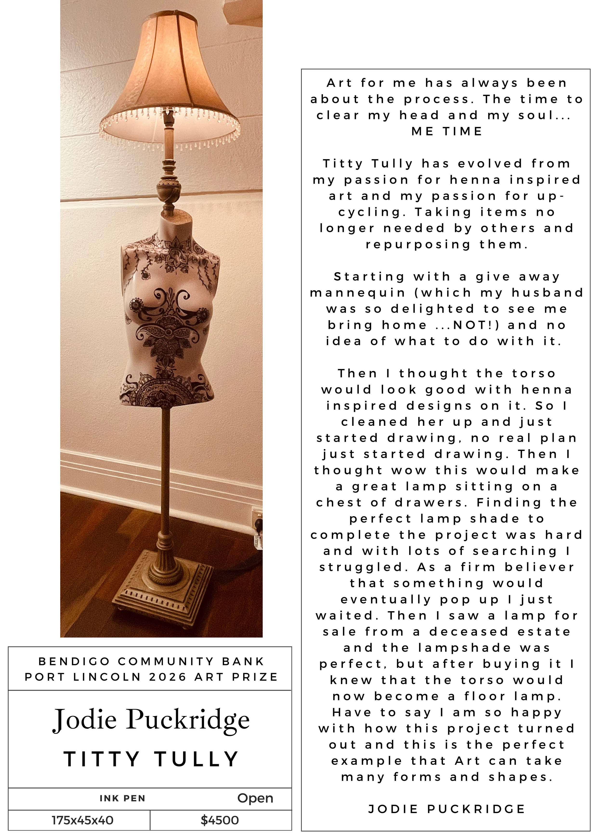 “I hope the people of Port Lincoln enjoy my entry this year ‘Bee’. The Blue-banded Bees (Amegilla cingulata) are beautiful native pollinators with blue stripes and furry bodies. I enjoyed creating this one!”