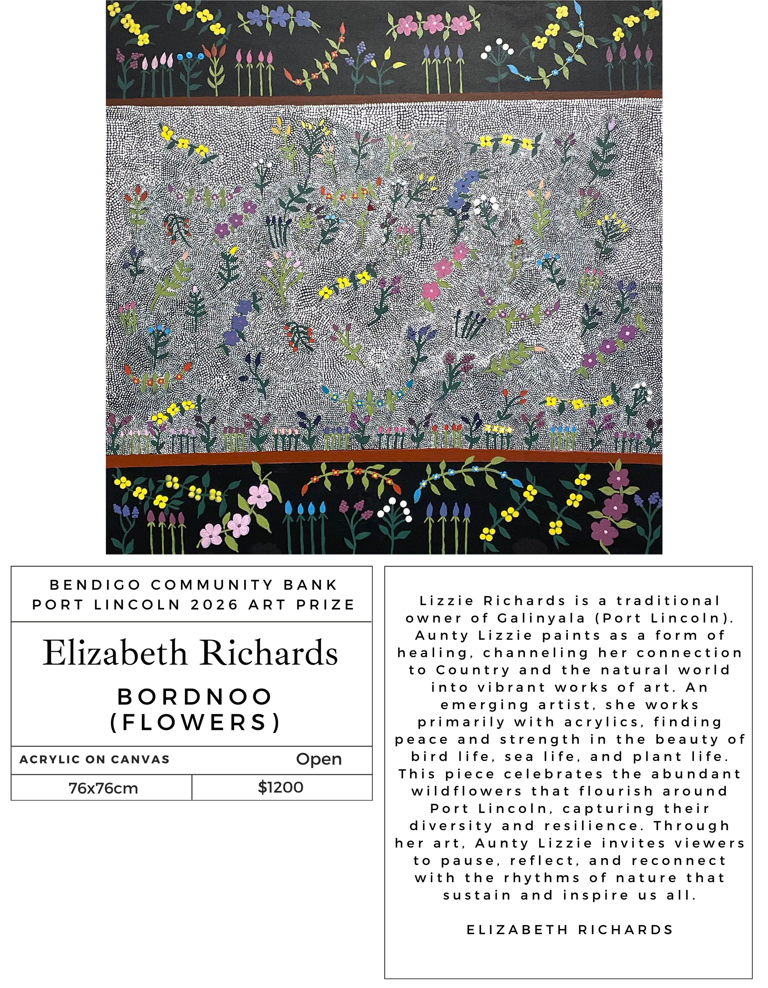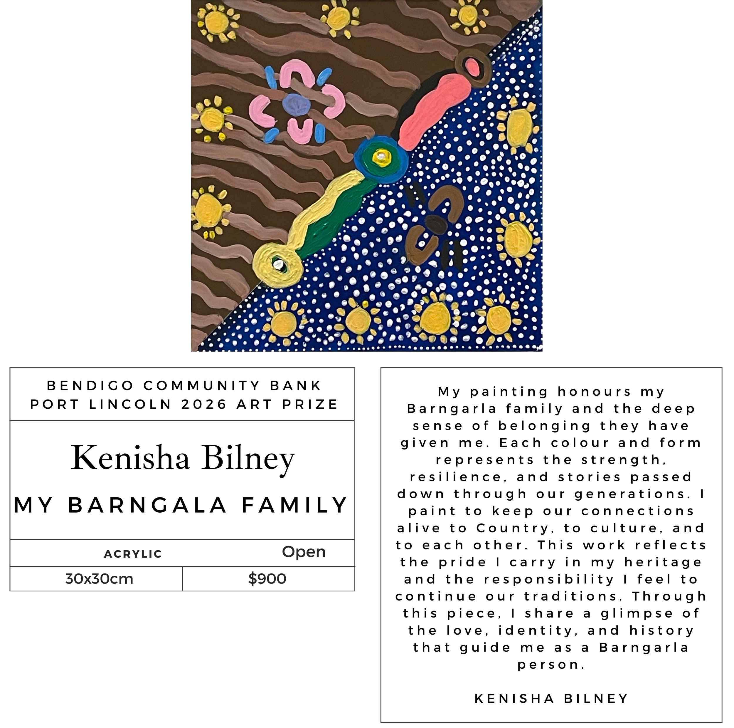 Her connection to country is strong and she is passionate about sharing this knowledge with the wider community as well as ensuring her children are taught traditional customs. Her creative inspiration is drawn through passion for her culture, heritage and the Dreaming and Creation Stories that have been passed down through her ancestors.