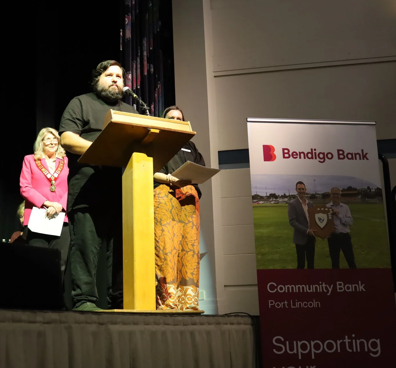 2026 Art Prize Judge Dominic Guerrera, First Nations Creative Producer, Country Arts SA, accompanied by City of Port Lincoln Mayor Daina Mislov and Manager Community, Culture & Recreation Helena Jones. Image courtesy Belili Cowley